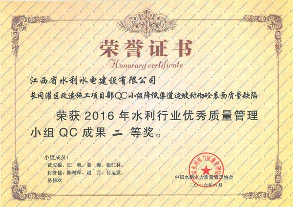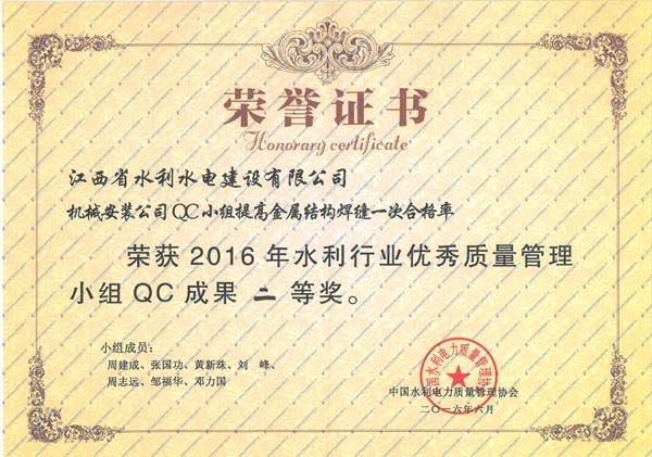 2016年6月20日至24日,中國水利電力質量管理協會水利分會在安徽省安慶市,舉辦了2016年水利行業優秀質量管理小組成果發表會,并在本次發表會上發布了156項QC成果。中國水利電力質量管理協會水利分會組織評審專家,對發表的QC成果進行了現場評審,對經評審獲得一、二等獎的單位進行了表彰。本次成果發表會上,我公司共有3項QC成果獲一等獎,兩項QC成果獲二等獎,成績較往年有較大幅度提高。