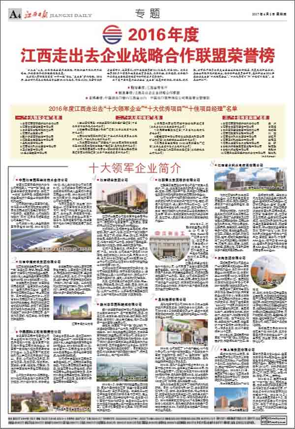 6月3日,江西走出去企業戰略合作聯盟2017年大會在南昌召開。省委常委、常務副省長毛偉明出席大會并作重要講話,會上省委常委、常務副省長毛偉明、省政府秘書長王亞聯和省商務廳廳長王水平分別為2016年度全省走出去“十大領軍企業”、“十大優秀項目”和“十佳項目經理”授牌。江西走出去企業戰略合作聯盟輪值主席、中國江西國際經濟技術合作公司總經理徐國建報告了2016年工作,國家開發銀行江西分行、中國進出口銀行江西省分行和中國出口信用保險公司南昌營管部作為聯盟副主席單位發言。公司董事長王元旦作為十大優秀項目的企業代表發言。《江西日報》、《江西衛視》相繼對大會進行了大幅報道。