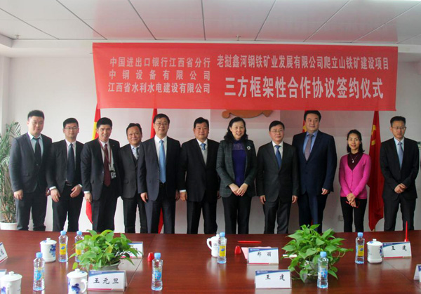 12月29日上午,在江西省商務(wù)廳副廳長(zhǎng)方向軍、外經(jīng)處處長(zhǎng)王健的見證下,公司與中國(guó)進(jìn)出口銀行江西省分行和中鋼設(shè)備有限公司就老撾鑫河鋼鐵礦業(yè)發(fā)展有限公司爬立山鐵礦建設(shè)項(xiàng)目正式簽訂三方框架性合作協(xié)議。中國(guó)進(jìn)出口銀行江西省分行行長(zhǎng)鄭麗、中鋼設(shè)備有限公司總經(jīng)理王建、公司董事長(zhǎng)王元旦、海外公司總經(jīng)理黃鄭民等出席簽約儀式。