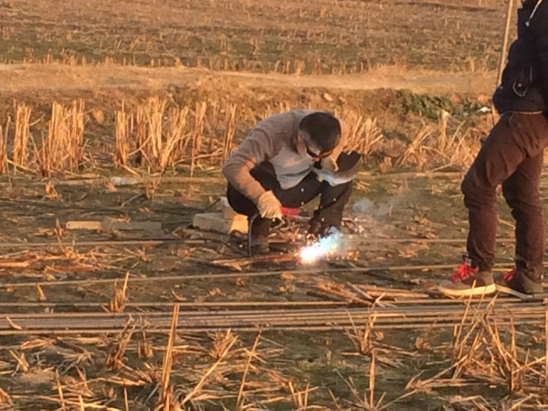 圖為官田機耕橋鋼筋制作現場,圖中為李金瑞經理在點焊鋼筋