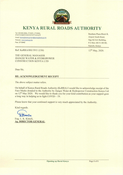 5月12日,江西水建肯尼亞分公司履行企業(yè)的社會責(zé)任,向肯尼亞鄉(xiāng)村公路局捐贈了10,000只防護(hù)口罩,用于支持其員工及員工所在社區(qū)的防疫工作。